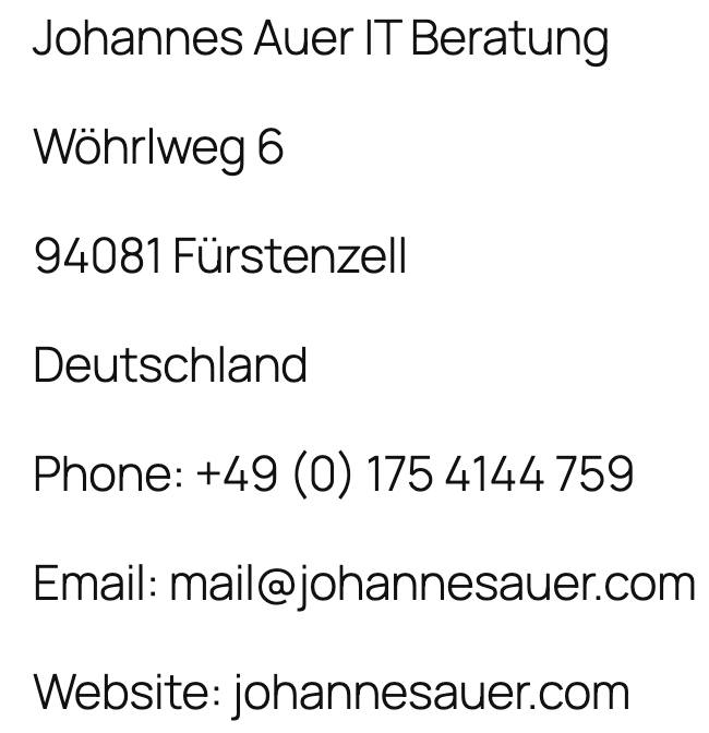 The Internet pages of the Johannes Auer IT Beratung use cookies. Cookies are text files that are stored in a computer system via an Internet browser.