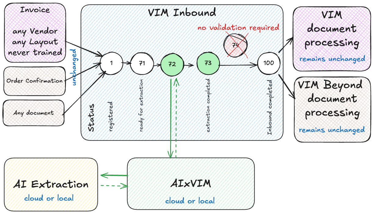 AIxVIM fits naturally into SAP VIM inbound scenarios such as IC4S and CC4S-like architectures, without requiring additional user interfaces, manual validation steps, or parallel processing tools. Existing SAP VIM staging tables and downstream processes remain unchanged, ensuring a clean and auditable integration.
